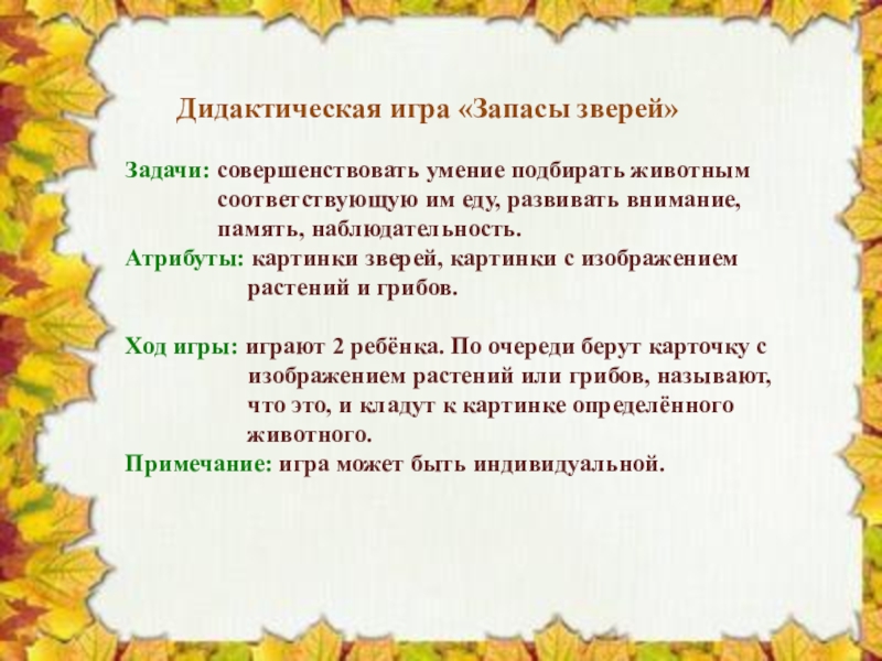 Слайд 6 Дидактическая игра «Запасы зверей»