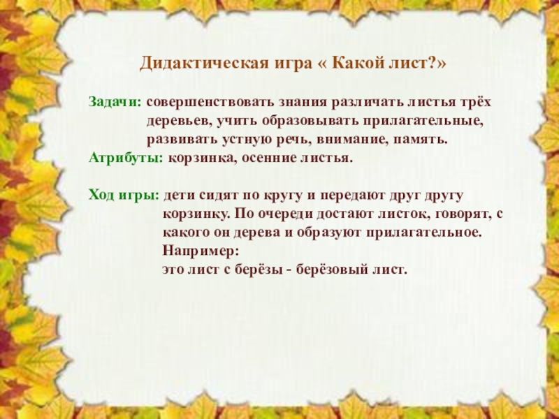 Слайд 9 Дидактическая игра « Какой лист?»