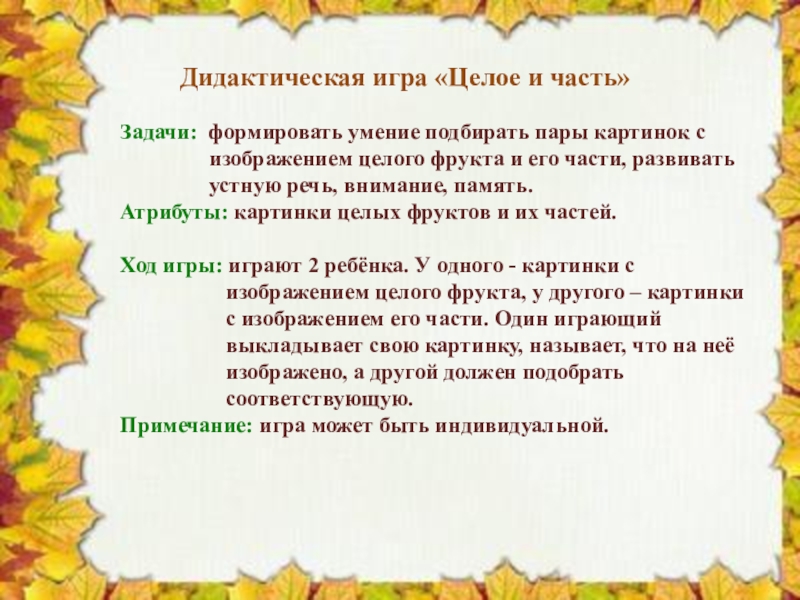 Слайд 4 Дидактическая игра «Целое и часть»