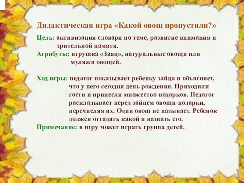 Слайд 16Дидактическая игра «Какой овощ пропустили?»