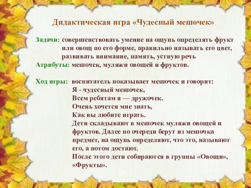 Слайд 3 Дидактическая игра «Чудесный мешочек»