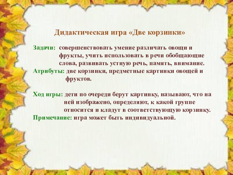 Слайд 5 Дидактическая игра «Две корзинки»