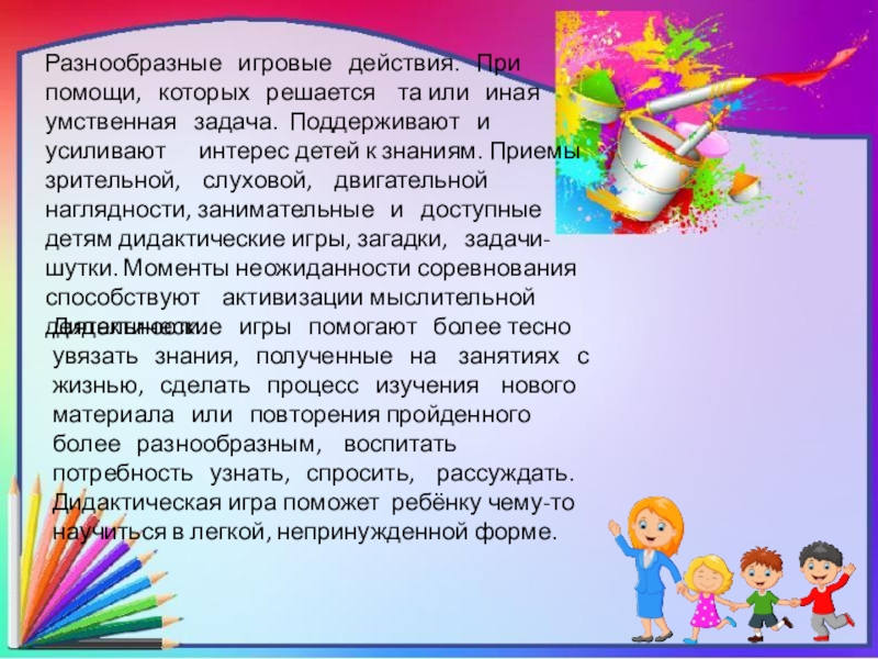 Дидактические игры помогают более тесно увязать знания, полученные на занятиях с жизнью, сделать процесс изучения нового материала или повторения пройденного более разнообразным, воспитать потребность узнать, спросить, рассуждать. Дидактическая игра поможет ребёнку чему-то научиться в легкой, непринужденной форме.