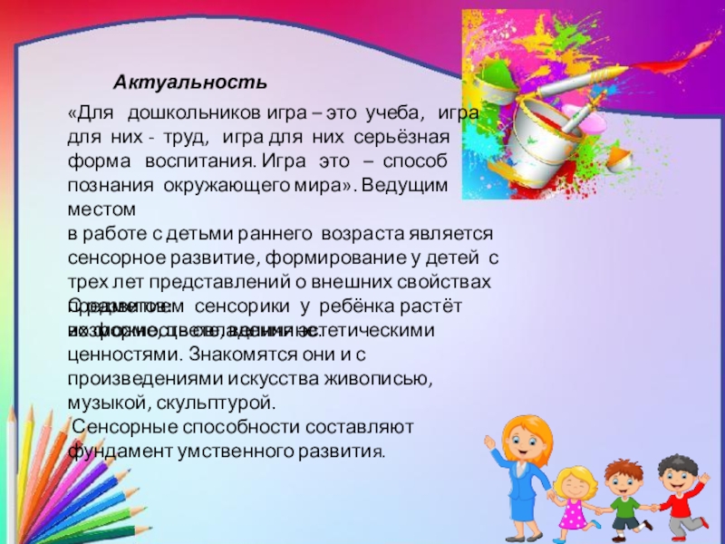С развитием сенсорики у ребёнка растёт возможность овладения эстетическими ценностями. Знакомятся они и с произведениями искусства живописью, музыкой, скульптурой.