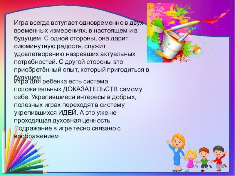 Игра для ребенка есть система положительных ДОКАЗАТЕЛЬСТВ самому себе. Укрепившиеся интересы в добрых, полезных играх переходят в систему укрепившихся ИДЕЙ. А это уже не проходящая духовная ценность. Подражание в игре тесно связано с воображением.