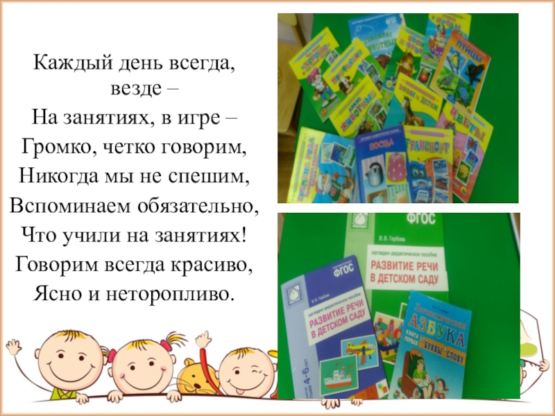 Каждый день всегда, везде – На занятиях, в игре – Громко, четко говорим, Никогда мы не спешим,
