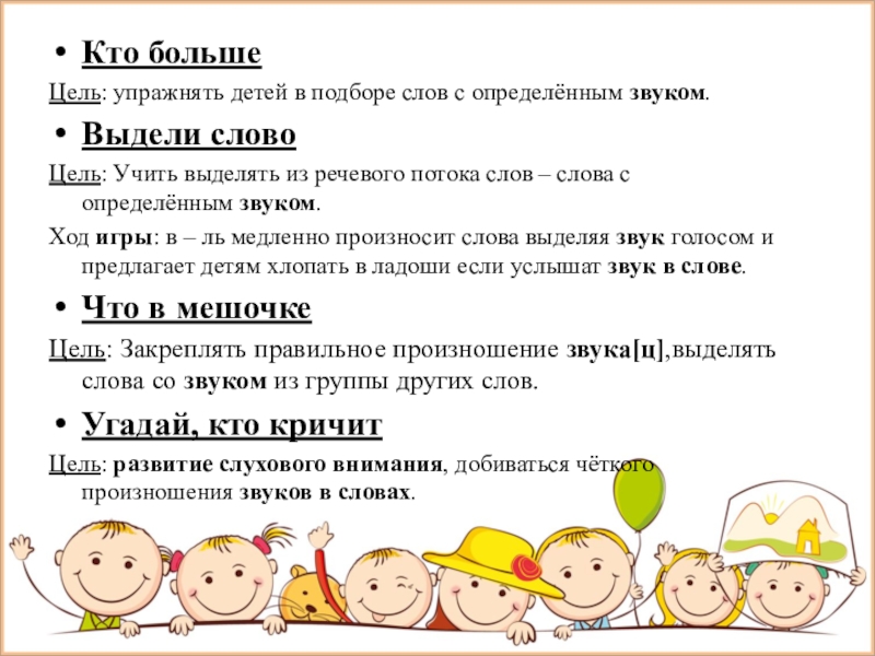 Кто большеЦель: упражнять детей в подборе слов с определённым звуком.Выдели словоЦель: Учить выделять из речевого потока слов –