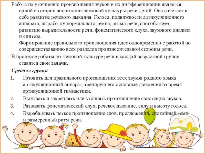 сторон воспитания звуковой культуры речи детей. Она сочетает в себе развитие речевого дыхания. Голоса, подвижности артикуляционного аппарата, выработку нормального темпа, ритма речи, способствует развитию выразительности речи, фонематического слуха, звукового анализа и синтеза. Формирование правильного произношения идет одновременно с работой по совершенствованию всех разделов произносительной стороны речи.