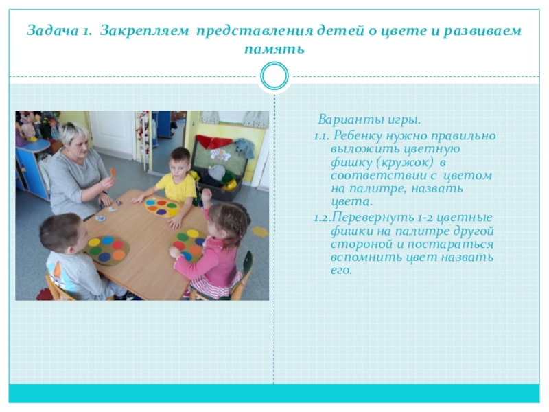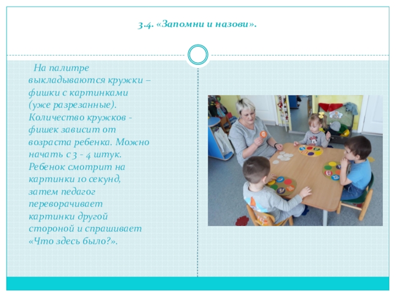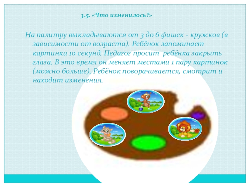 Перед игрой дети договариваются, что они будут рисовать: одежду, животных, игрушки или транспорт. Педагог отбирает фишки - кружочки только по этим темам, перемешивает их и раздает детям палитры. Затем педагог берет 1 фишку и спрашивает: