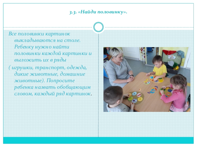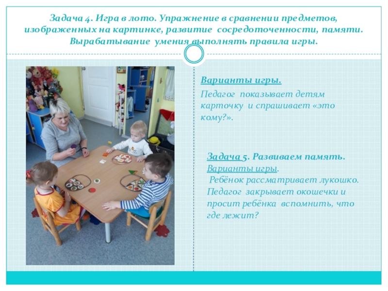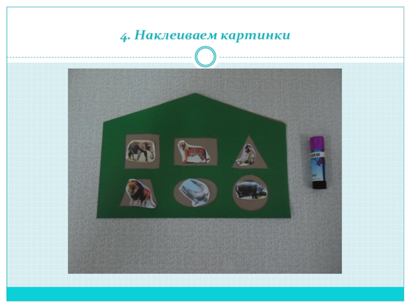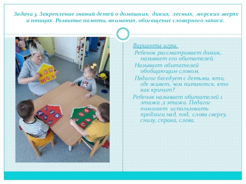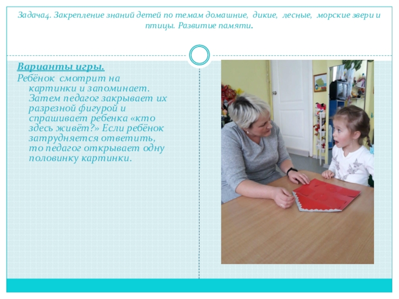 Ребёнок смотрит на картинки и запоминает. Затем педагог закрывает их разрезной фигурой и спрашивает ребенка «кто здесь живёт?» Если ребёнок затрудняется ответить, то педагог открывает одну половинку картинки.