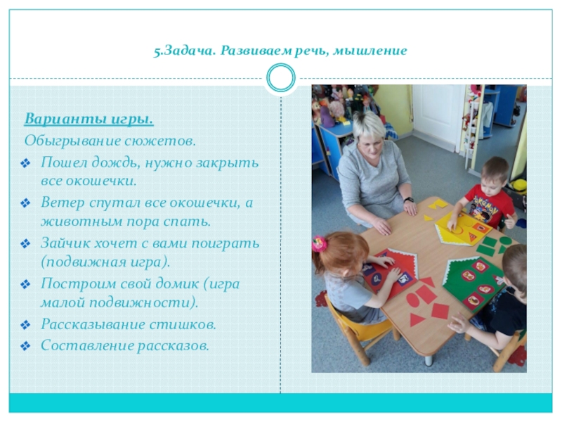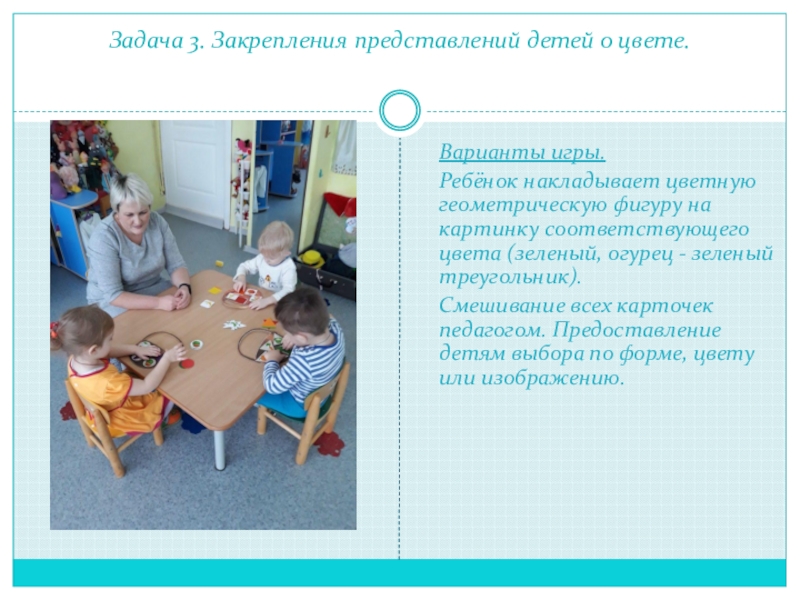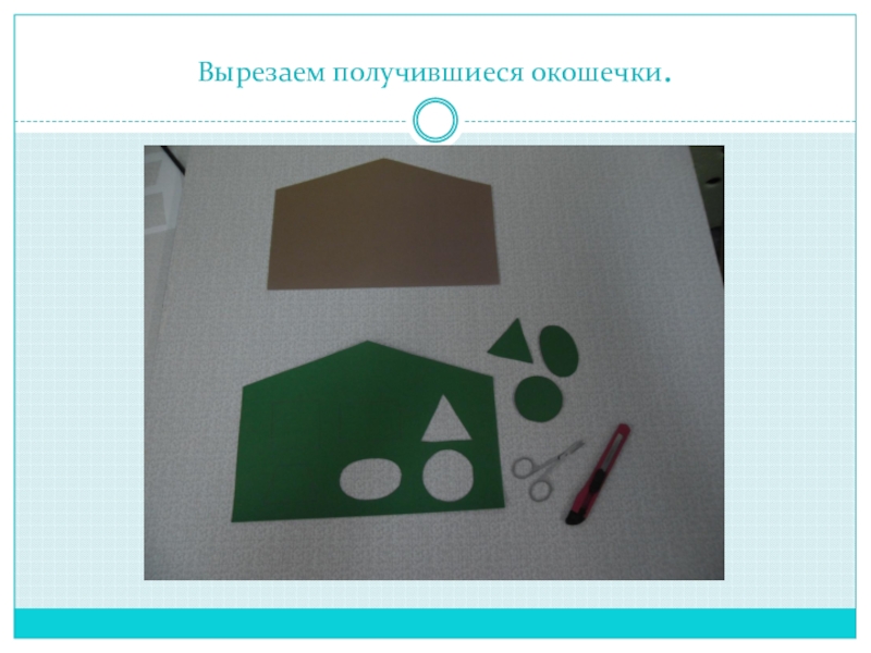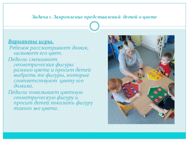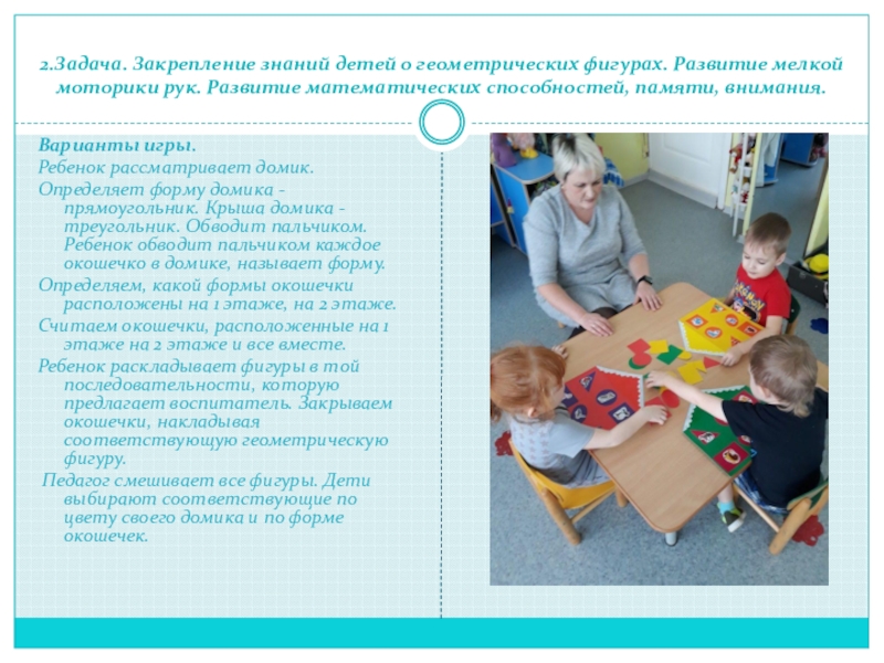 Педагог смешивает все фигуры. Дети выбирают соответствующие по цвету своего домика и по форме окошечек.