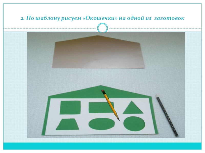 Определяет форму домика - прямоугольник. Крыша домика - треугольник. Обводит пальчиком. Ребенок обводит пальчиком каждое окошечко в домике, называет форму.