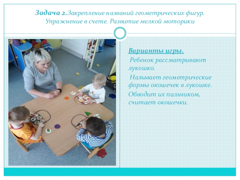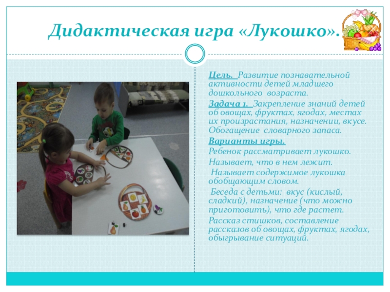 Ребёнок рассматривает лукошко. Педагог закрывает окошечки и просит ребёнка вспомнить, что где лежит?
