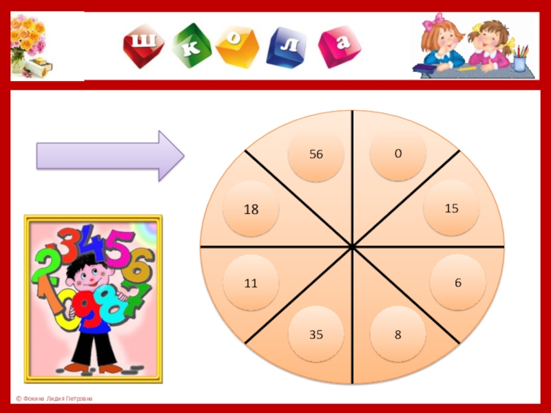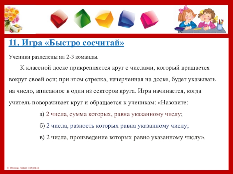 К классной доске прикрепляется круг с числами, который вращается вокруг своей оси; при этом стрелка, начерченная на доске, будет указывать на число, вписанное в один из секторов круга. Игра начинается, когда учитель поворачивает круг и обращается к ученикам: «Назовите: