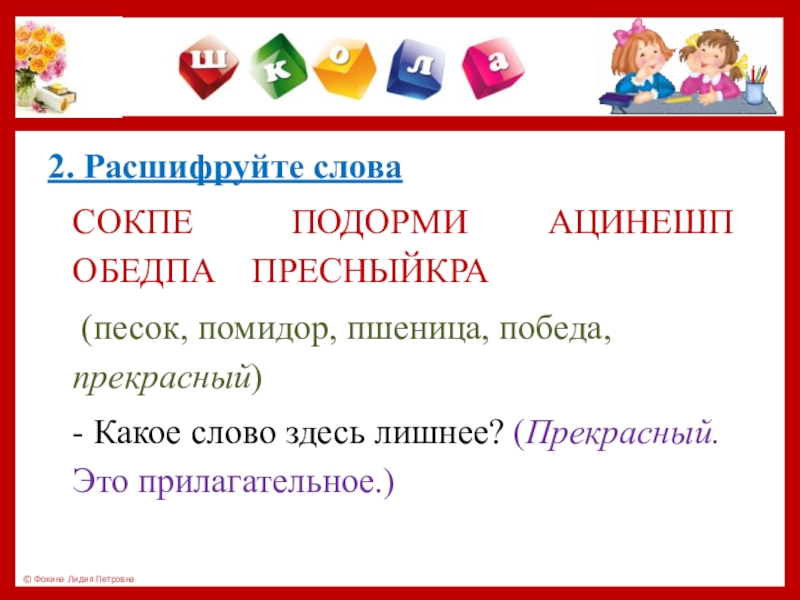 - Какое слово здесь лишнее? (Прекрасный. Это прилагательное.)