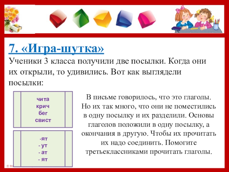 В письме говорилось, что это глаголы. Но их так много, что они не поместились в одну посылку и их разделили. Основы глаголов положили в одну посылку, а окончания в другую. Чтобы их прочитать их надо соединить. Помогите третьеклассниками прочитать глаголы.