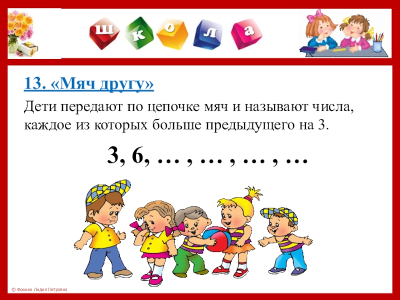 передают по цепочке мяч и называют числа, каждое из которых больше предыдущего на 3.
