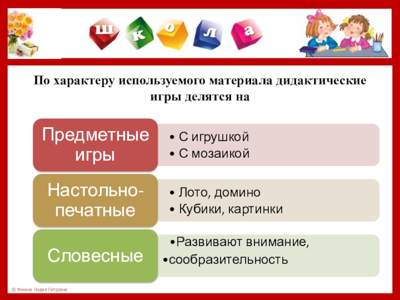 Слайд 4По характеру используемого материала дидактические игры делятся на
