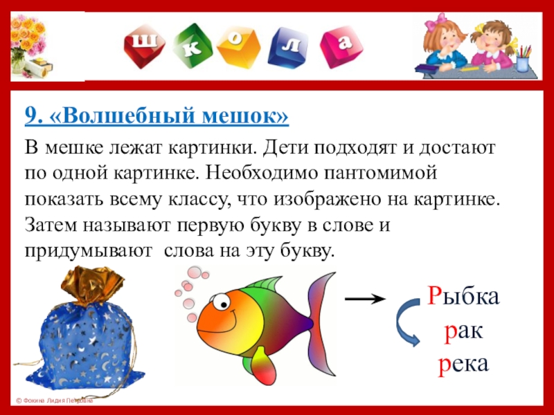 одной картинке. Необходимо пантомимой показать всему классу, что изображено на картинке. Затем называют первую букву в слове и придумывают слова на эту букву.