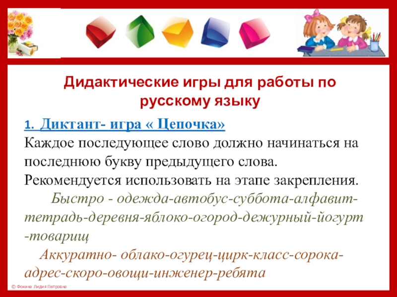 последующее слово должно начинаться на последнюю букву предыдущего слова. Рекомендуется использовать на этапе закрепления.