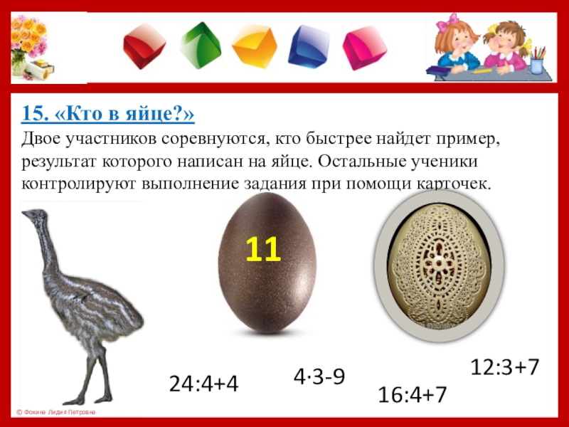 которого написан на яйце. Остальные ученики контролируют выполнение задания при помощи карточек.