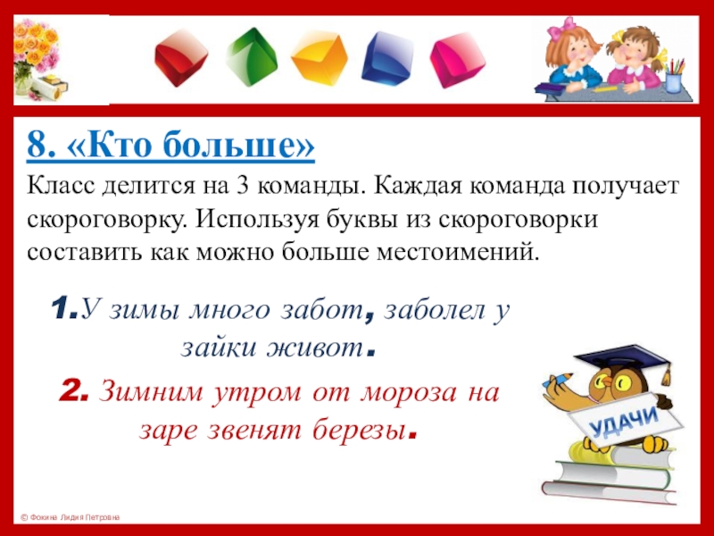 Класс делится на 3 команды. Каждая команда получает скороговорку.