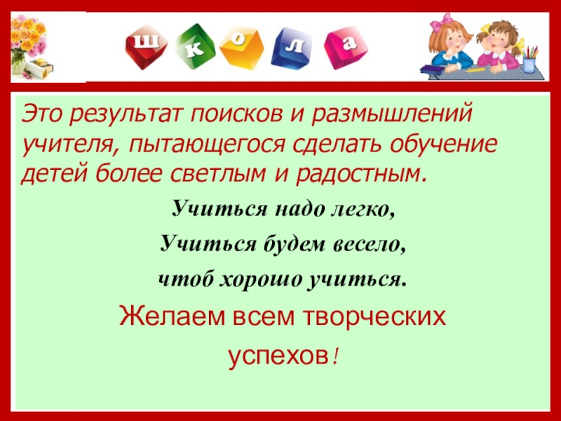 Слайд 24Это результат поисков и размышлений учителя, пытающегося сделать обучение детей более