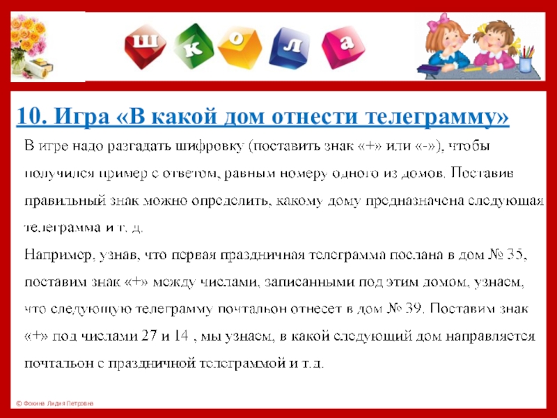 Слайд 1610. Игра «В какой дом отнести телеграмму»