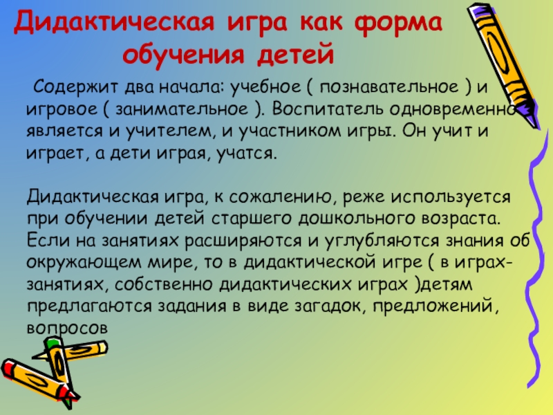Дидактическая игра, к сожалению, реже используется при обучении детей старшего дошкольного возраста. Если на занятиях расширяются и углубляются знания об окружающем мире, то в дидактической игре ( в играх-занятиях, собственно дидактических играх )детям предлагаются задания в виде загадок, предложений, вопросов