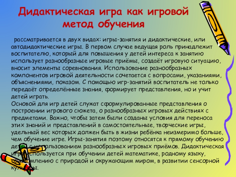 Основой для игр детей служат сформулированные представления о построении игрового сюжета, о разнообразных игровых действиях с предметами. Важно, чтобы затем были созданы условия для переноса этих знаний и представлений в самостоятельные, творческие игры, удельный вес которых должен быть в жизни ребёнка неизмеримо больше, чем обучение игре. Игры-занятия поэтому относятся к прямому обучению детей с использованием разнообразных игровых приёмов. Дидактическая игра используется при обучении детей математике, родному языку, ознакомлению с природой и окружающим миром, в развитии сенсорной культуры.
