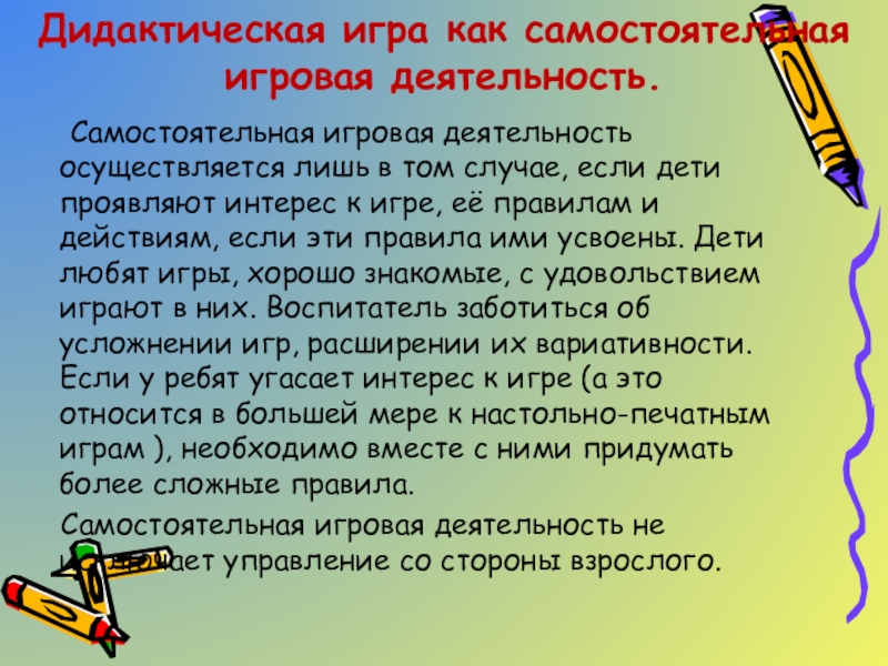 Слайд 5Дидактическая игра как самостоятельная игровая деятельность.