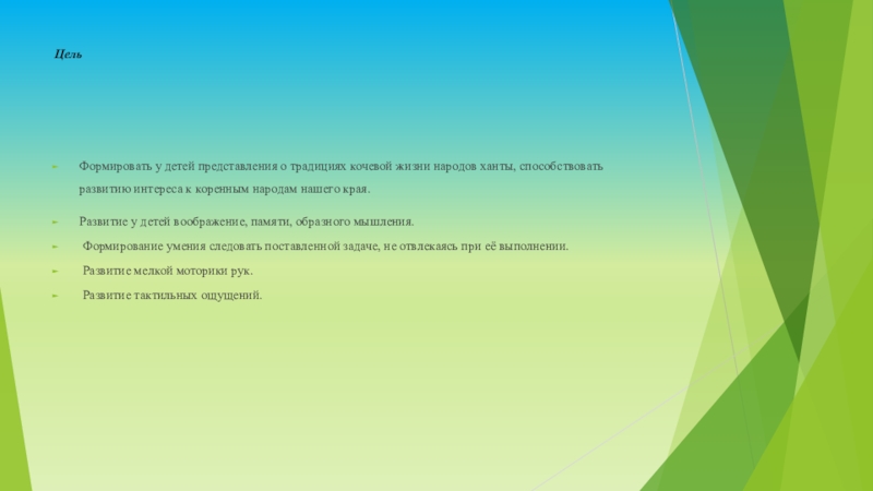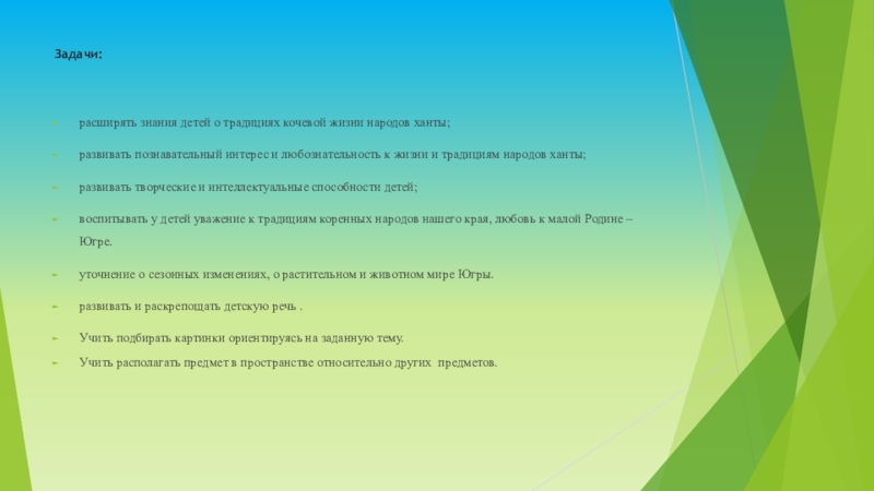 ЦельФормировать у детей представления о традициях кочевой жизни народов ханты, способствовать развитию интереса к коренным народам нашего