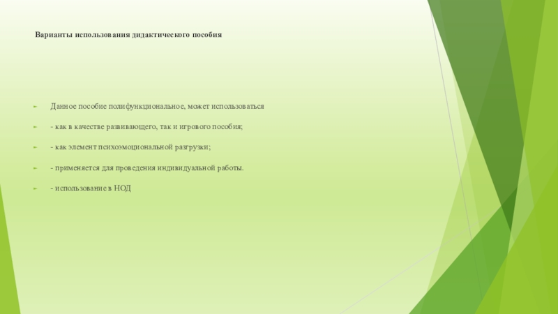 Варианты использования дидактического пособияДанное пособие полифункциональное, может использоваться- как в качестве развивающего, так и игрового пособия;- как