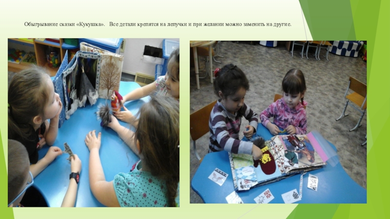Слайд 8Обыгрывание сказки «Кукушка». Все детали крепятся на лепучки и при