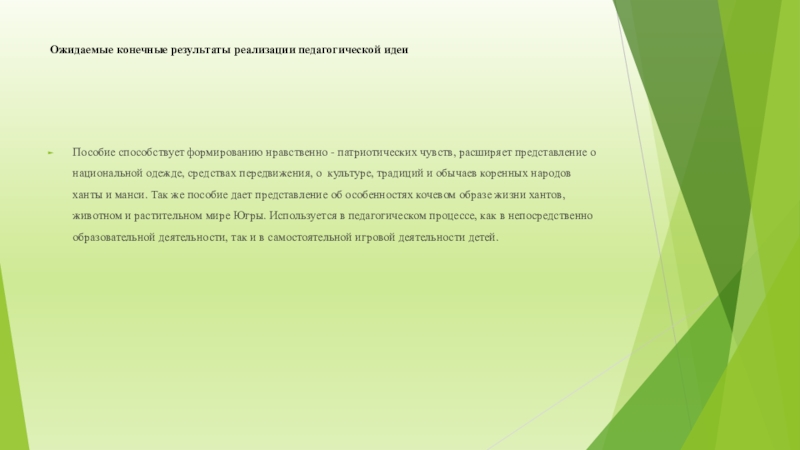 Ожидаемые конечные результаты реализации педагогической идеиПособие способствует формированию нравственно - патриотических чувств, расширяет представление о национальной одежде,