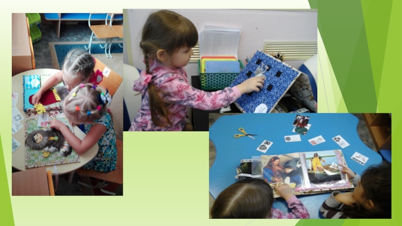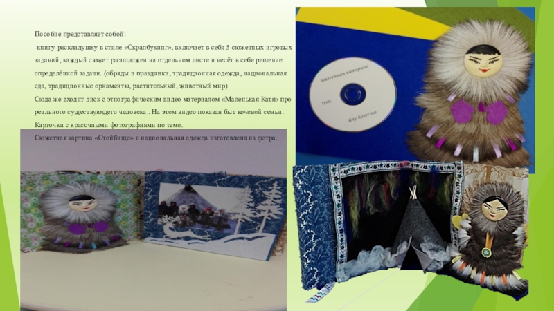 сюжетных игровых заданий, каждый сюжет расположен на отдельном листе и несёт в себе решение определённой задачи. (обряды и праздники, традиционная одежда, национальная еда, традиционные орнаменты, растительный, животный мир) Сюда же входит диск с этнографическим видео материалом «Маленькая Катя» про реального существующего человека . На этом видео показан быт кочевой семьи. Карточки с красочными фотографиями по теме. Сюжетная картина «Стойбище» и национальная одежда изготовлена из фетра.