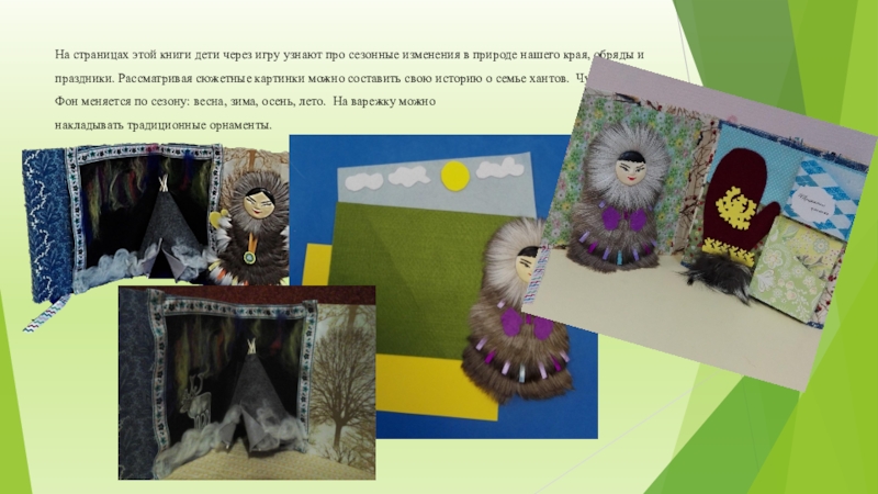 в природе нашего края, обряды и праздники. Рассматривая сюжетные картинки можно составить свою историю о семье хантов. Чум съемный. Фон меняется по сезону: весна, зима, осень, лето. На варежку можно накладывать традиционные орнаменты.