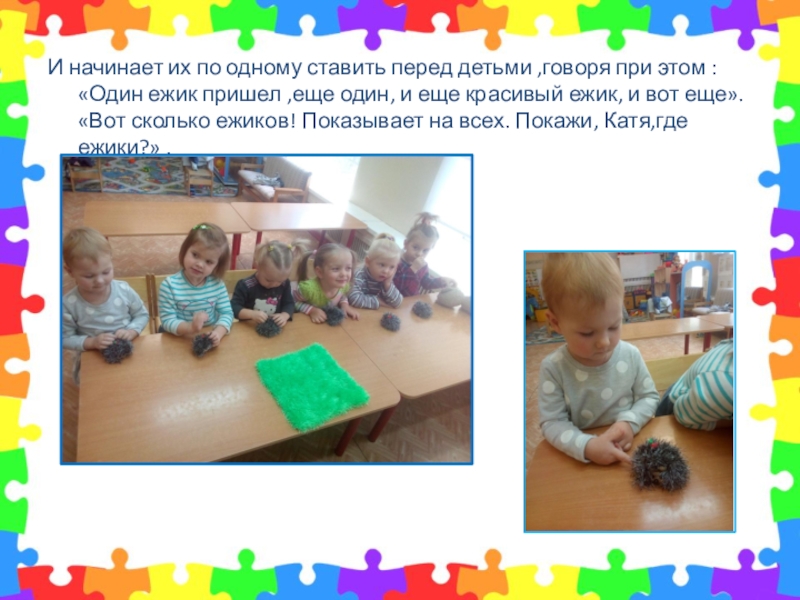 : «Один ежик пришел ,еще один, и еще красивый ежик, и вот еще». «Вот сколько ежиков! Показывает на всех. Покажи, Катя,где ежики?» .