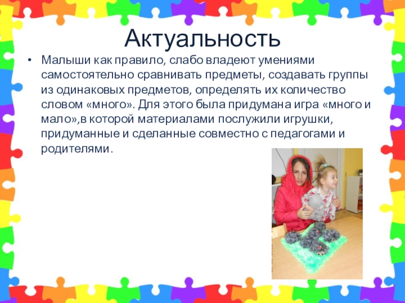 Актуальность Малыши как правило, слабо владеют умениями самостоятельно сравнивать предметы, создавать группы из одинаковых предметов, определять их количество словом «много». Для этого была придумана игра «много и мало»,в которой материалами послужили игрушки, придуманные и сделанные совместно