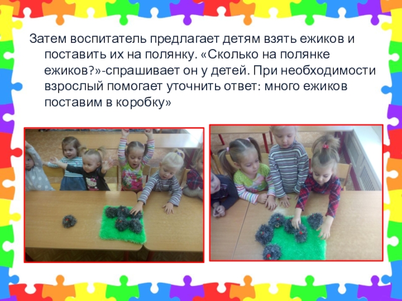 «Сколько на полянке ежиков?»-спрашивает он у детей. При необходимости взрослый помогает уточнить ответ: много ежиков поставим в коробку»