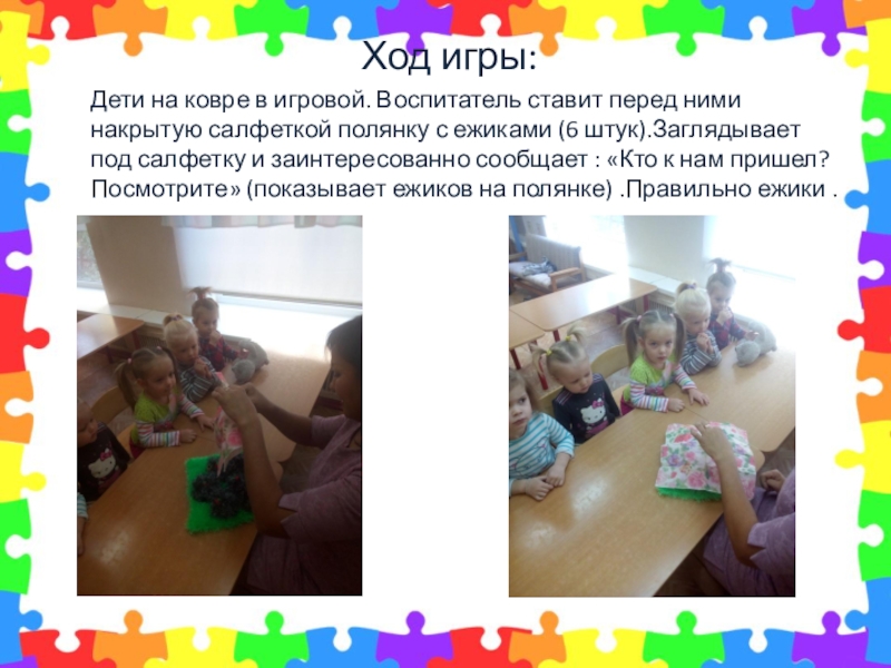 перед ними накрытую салфеткой полянку с ежиками (6 штук).Заглядывает под салфетку и заинтересованно сообщает : «Кто к нам пришел? Посмотрите» (показывает ежиков на полянке) .Правильно ежики .