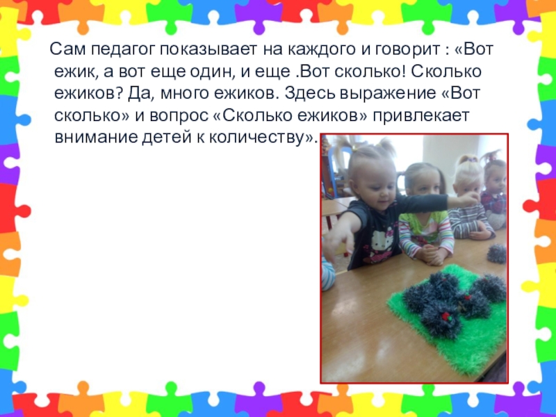 ежик, а вот еще один, и еще .Вот сколько! Сколько ежиков? Да, много ежиков. Здесь выражение «Вот сколько» и вопрос «Сколько ежиков» привлекает внимание детей к количеству».
