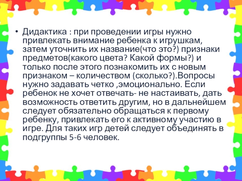 Слайд 3Дидактика : при проведении игры нужно привлекать внимание ребенка к игрушкам,