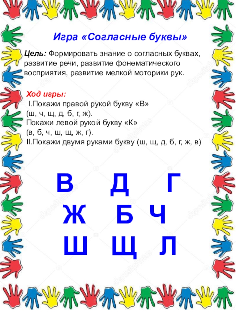 II.Покажи двумя руками букву (ш, щ, д, б, г, ж, в)
