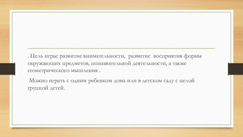 . Цель игры: развитие внимательности,  развитие восприятия формы окружающих предметов, познавательной деятельности, а также геометрического мышления .