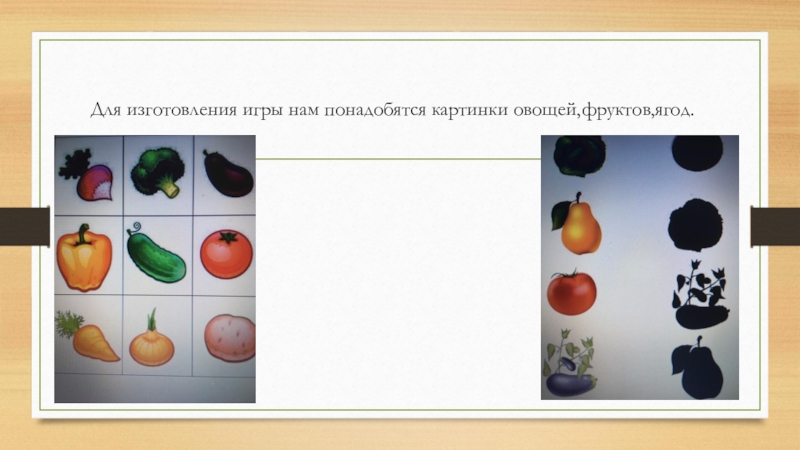 Слайд 4Для изготовления игры нам понадобятся картинки овощей,фруктов,ягод.