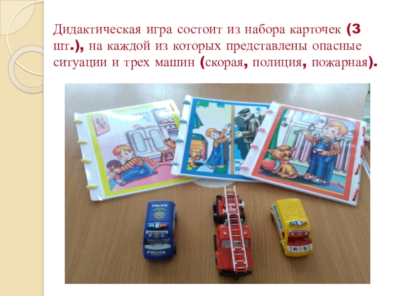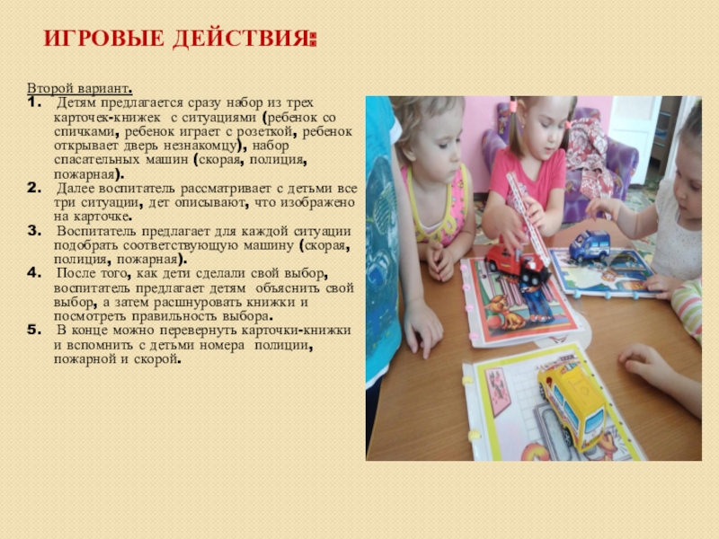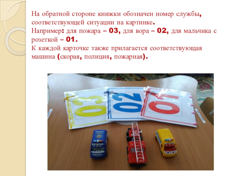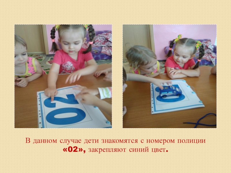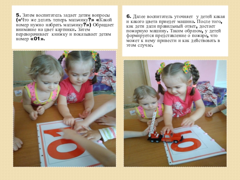 6. Далее воспитатель уточняет у детей какая и какого цвета приедет машина. После того, как дети дали правильный ответ, достает пожарную машину. Таким образом, у детей формируется представление о пожаре, что может к нему привести и как действовать в этом случае.