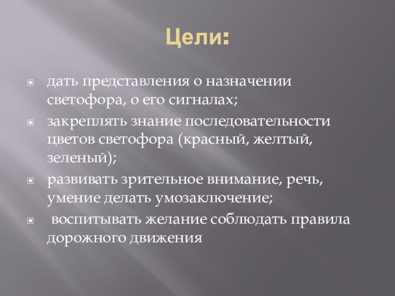 Цели:дать представления о назначении светофора, о его сигналах; закреплять знание последовательности цветов светофора (красный, желтый, зеленый); развивать зрительное внимание, речь, умение делать умозаключение; воспитывать желание соблюдать правила дорожного движения