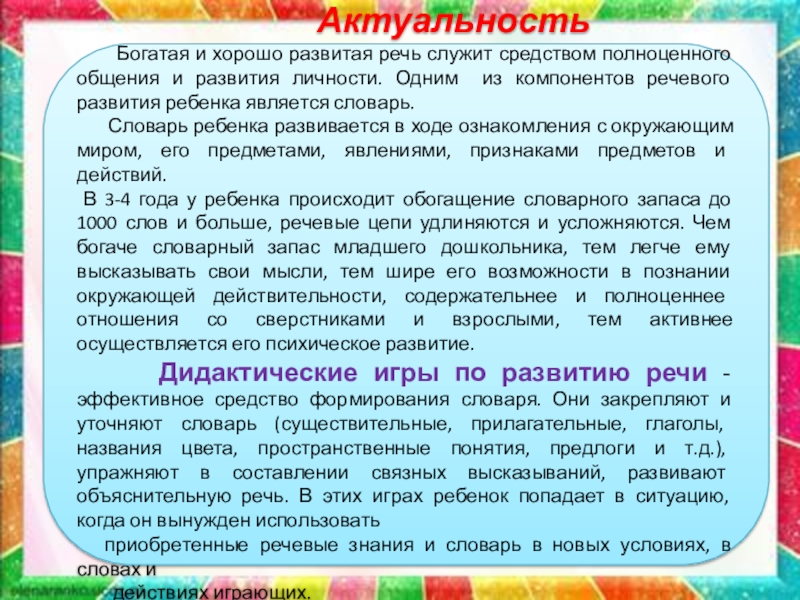 Богатая и хорошо развитая речь служит средством полноценного общения и развития личности. Одним из компонентов речевого развития ребенка является словарь.