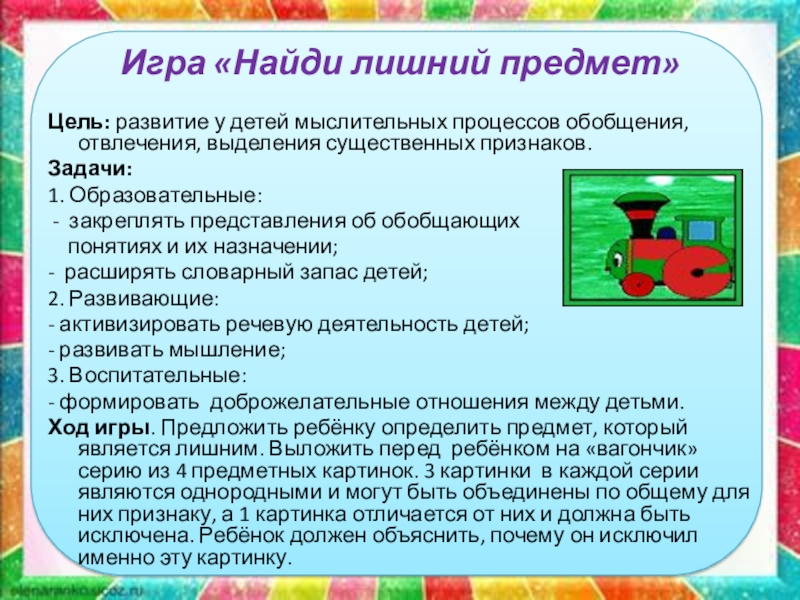 Ход игры. Предложить ребёнку определить предмет, который является лишним. Выложить перед ребёнком на «вагончик» серию из 4 предметных картинок. 3 картинки в каждой серии являются однородными и могут быть объединены по общему для них признаку, а 1 картинка отличается от них и должна быть исключена. Ребёнок должен объяснить, почему он исключил именно эту картинку.